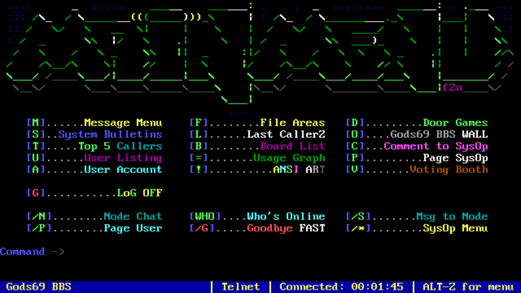 Pour y accéder il vous faut un client Telnet et indiquer l’adresse « bbs.gods69.com » et le port: 2323 . Le BBS est dédié aux machines rétro et à l’électronique.